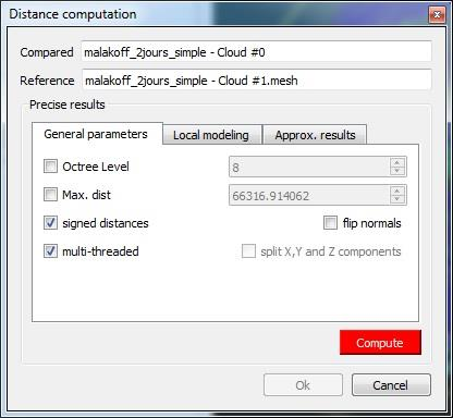 当出现“云/云距离计算”对话框时,CloudCompare将首先计算近似距离(这些距离用于内部自动设置执行真实距离