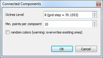 八叉树层级:CloudCompare采用三维网格提取连通组件(与原始算法相同)。该网格结构源自八叉树架构。通过选择八叉树层级,可设定两个组件之间的最小间隙大小(对应单元尺寸会显示在层级旁)。层级越高,间隙越小(因此可能生成更多组件)。