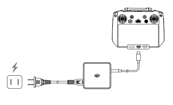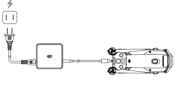 首次使用需给智能飞行电池充电以唤醒电池。使用标配充电器,连接飞行器 USB-C 接口充电。开始充电即可唤醒电池,完全充满约需时 1 小时 20 分钟。