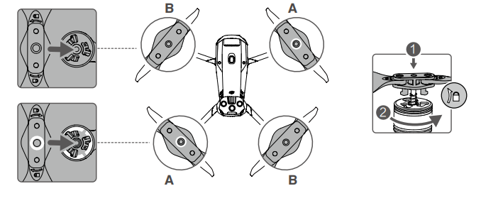 带标记和不带标记的螺旋桨分别指示了不同的旋转方向。将带标记的螺旋桨安装至带有标记的电机桨座上。将桨帽嵌入电机桨座并按压到底,沿锁紧方向旋转螺旋桨到底,松手后螺旋桨将弹起锁紧。使用同样的方法安装不带标记的螺旋桨至不带标记的电机桨座上。安装完毕后展开桨叶。