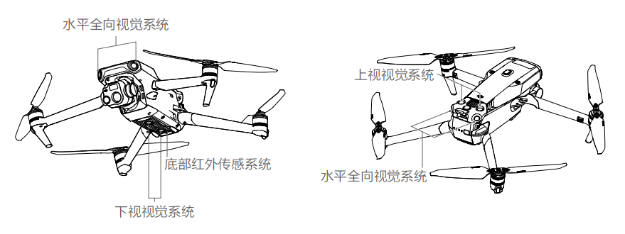 • 视觉系统在水面上可能无法正常工作。因此,当降落功能触发时,飞行器可能无法主动回避下方水域。建议用户对飞行保持全程控制,并根据周围环境进行合理判断,不过度依赖视觉系统。