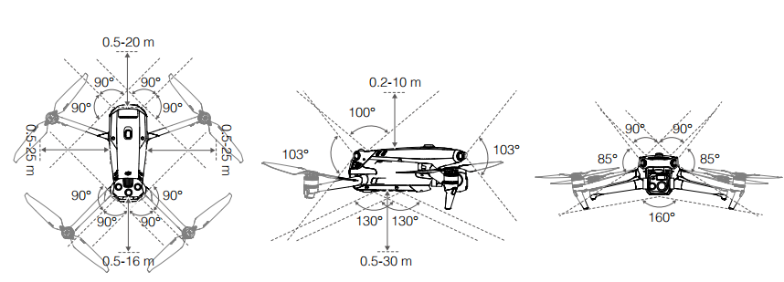精确测距范围:0.3-18 m,视角(FOV):前后 130°,左右 160°。精确悬停范围 0.5-30 m。