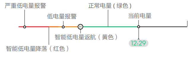 ⚠️ 电池能量槽上的颜色区间以及预计剩余飞行时间信息,将根据飞行器的飞行高度以及离返航点的距离动态调整。