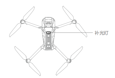 飞行器底部配备补光灯,辅助下视视觉系统工作。在环境光线不足且飞行高度 5 m 以下时,补光灯默认自动开启。用户也可在 DJI Pilot 2 App 中手动开启或关闭补光灯,每次重启飞行器后补光灯打开方式恢复为自动。