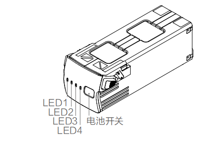 短按电池开关一次,再长按电池开关 2 秒以上,即可开启 / 关闭智能飞行电池。电池开启时,电量指示灯显示当前电池电量;电池关闭后,指示灯均熄灭。
