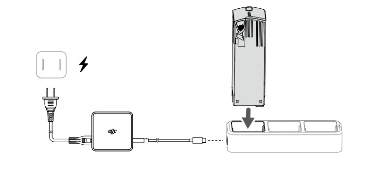 每次使用智能飞行电池前,请务必充满电。智能飞行电池必须使用 DJI 官方提供的充电管家以及专用电源适配器进行充电。