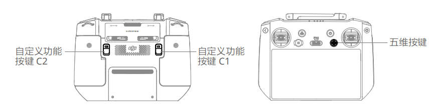 自定义功能按键包含 C1、C2 和五维按键,可在 DJI Pilot 2 相机界面 >