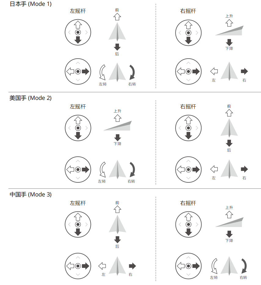 遥控器摇杆操控方式分为日本手、美国手和中国手,如下图所示。