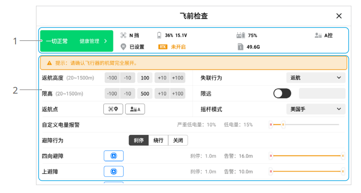 - 设置返航高度、失控动作、限高、限远,刷新返航点,选择摇杆模式,设置电量报警阈值、避障行为、避障开关和避障距离。