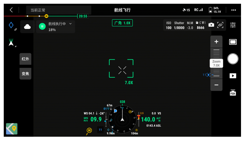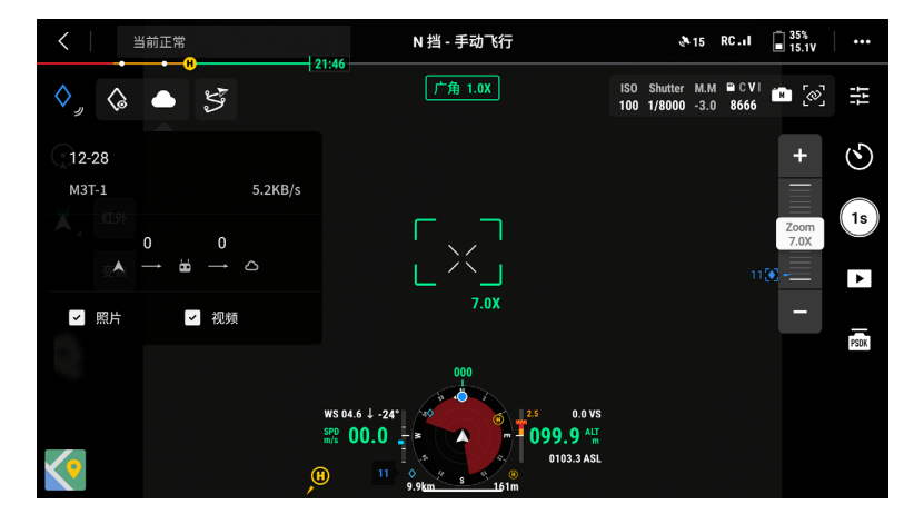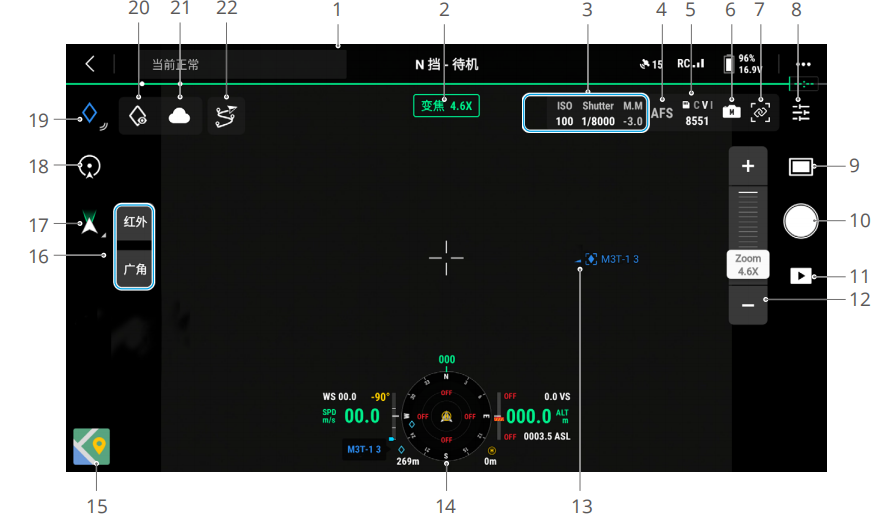 DJI Pilot 2 App 首页中点击“进入飞行界面”,完成飞前检查后,默认进入相机画面。下面以Mavic 3T 的变焦模式为主画面进行说明。