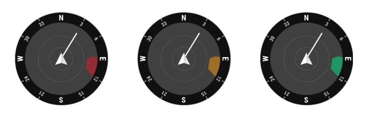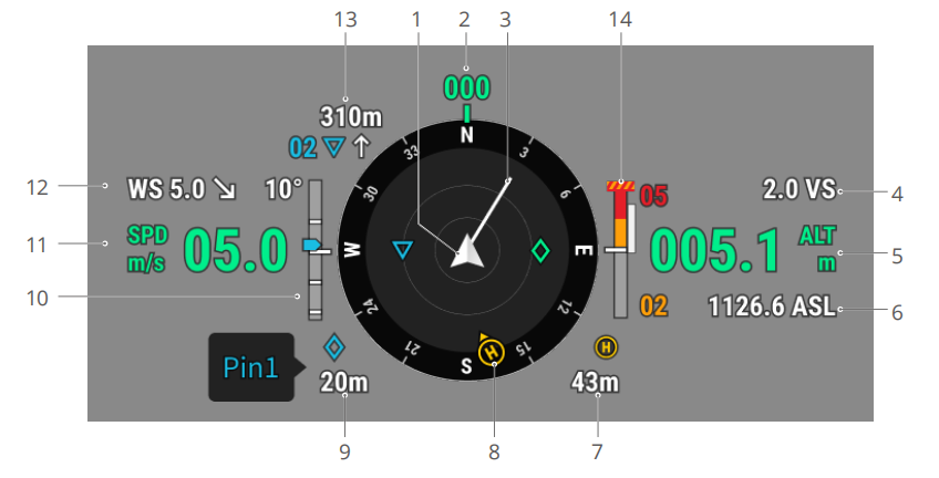 - 飞行器朝向:该数字为当前飞行器的朝向及角度,该角度在罗盘上以北为 0 度,每 30 度为步长,顺时针进行角度排布,360 度后回到正北方,如罗盘中的数字 24 表示飞行器正北 0度顺时针旋转 240 度后的航向位置。