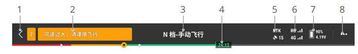 - 顶部状态栏:顶部状态栏将显示飞行器状态、挡位、信号质量等信息。详细内容请阅读顶部状态栏章节。
