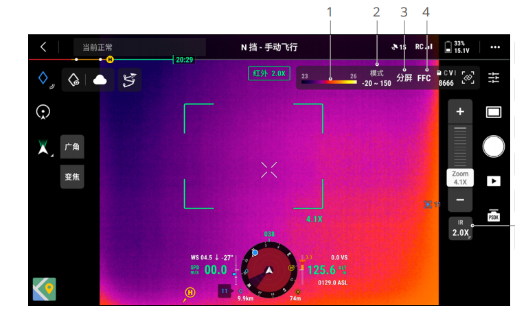 - 分屏:红外模式默认为单红外画面,点击可开启或关闭分屏功能,开启后可同时显示变焦和红外画面。