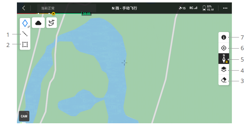 - 图层选择:点击可根据作业需要选择卫星或街道地图(标准模式)。若已通过 DJI Pilot 2 App 主页中我的 > 地图设置 >MPTiler> 自定义图层导入了 MBTiles 格式地图,在当前地图界面所示为 MPTiler 地图时,可选择将已导入的一个或多个 MBTiles 格式地图叠加在当前地图上。
