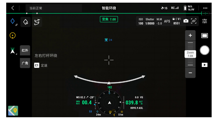 - 在相机界面点击智能环绕图标 ,进入智能环绕模式,此时飞行器自动看向选中 Pin 点,相机界面中出现环绕速度条,地图界面中出现圆形环绕航线。