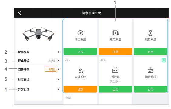 - 异常诊断:用于查看当前飞行器各模块健康状况,用户可根据提示解决相应异常。
