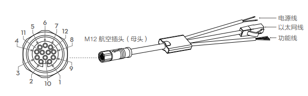 Mid-360 使用高可靠性的 M12 航空插头(公头)。该插头为符合 IEC 61076-2-101 标准的 M12 12P A-CODE 公头连接器,对应的母头连接器推荐型号为 Finecables MA12FAHD12STXXXB14,均符合 IP67 防护要求。用户可以通过 Livox 航插一分三线(需额外购买)连接至 Mid-360,实现电源连接、控制信号传输及数据传输等,也可以根据自身需求使用其它线材来代替 Livox 航插一分三线,提高其系统的防护能力(如防尘防水性)。