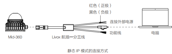 d. 将 Livox 航插一分三线上的外部电源线连接至外部电源,注意输入电压范围和极性。