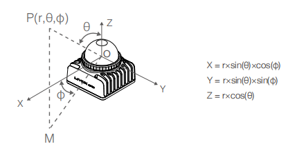 坐标信息:Mid-360 的坐标信息可表示为直角坐标系(x, y, z)或球坐标系(r, θ, φ),其直角坐标和球坐标的对应关系如下图所示。如果前方无被探测物体或者被探测物体超出量程范围(例如>100 m),在直角坐标系下,点云输出为(0, 0, 0);在球坐标系下,点云输出为(0, θ, φ)。