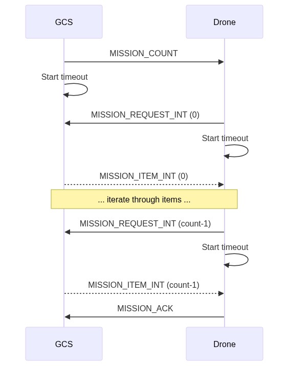 - 无人机和 GCS 重复 MISSION_REQUEST_INT/MISSION_ITEM_INT 循环,迭代序列直到所有项目上传(seq==count-1)。