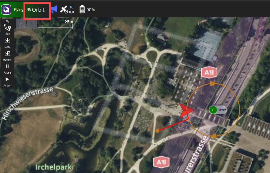 当无人机处于环绕模式,并向QGC持续报告环绕模式状态时,QGC上将显示规划的环绕模式轨迹,飞行状态将显示为Orbit
