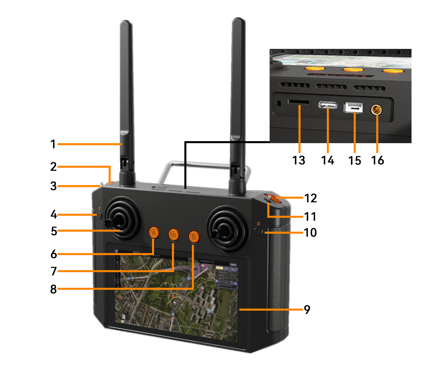 | 天线 | 左拨轮 | 三段开关E | 按键C | 摇杆 | 按键A | 电源开关 | 按键B |